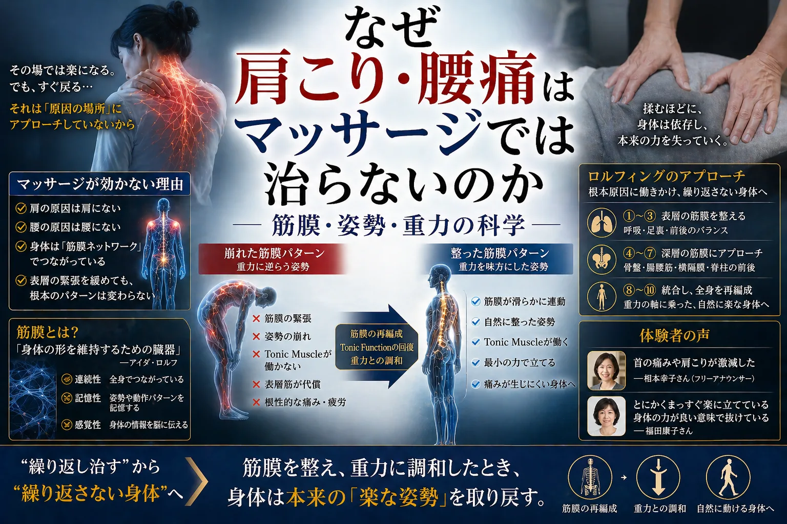 肩こりや腰痛を「繰り返し治す」のではなく、「繰り返さない身体を作る」——これがロルフィングの根本的な違いだ。